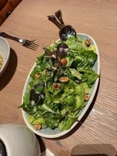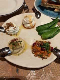 The experience began with a sampler of dips: whipped ricotta with maple syrup, the tomato-pomegranate spread was vibrant and slightly sweet, the fava-bean hummus was rich and earthy, and the spinach tzatziki was refreshing with a pleasant tang. Every bite felt thoughtfully crafted and full of fresh flavor. We enjoyed a crisp green salad with fresh herbs and toasted hazelnuts, a perfect palate refresher before the mains.